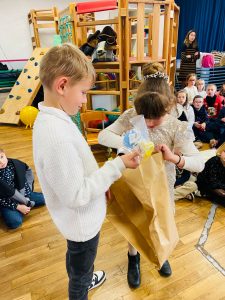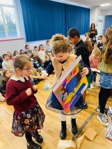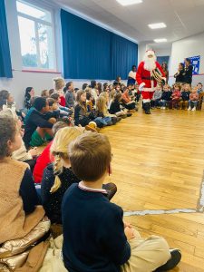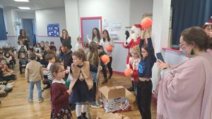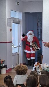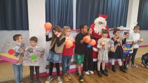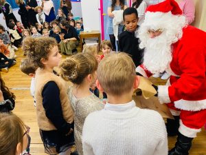 Puis, le Père Noël est passé pour le plus grand bonheur des élèves! Il a distribué les cadeaux de classe ainsi que des sapins au chocolat et des sucres d’orge! Merci à l’APEL pour ces attentions!