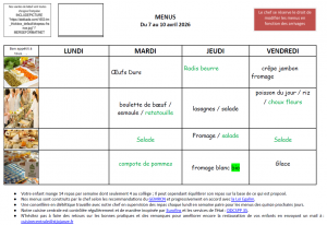 Menu maternelle du 07 au 10 avril 2026